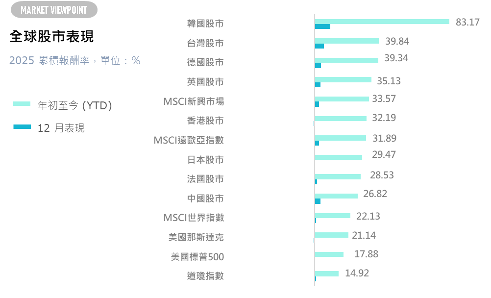 美國方面,政府於 11 月中結束停擺後,統計機構開始追補延遲數據,但第四季經濟數字仍偏雜訊,市場在評估景氣與聯準會政策時,更重視企業財報、PMI 與就業等私部門指標;12 月降息一碼,有助穩定整體風險資產評價。台灣與部分亞股在 AI 供應鏈帶動下表現相對具韌性,歐股則受利率見頂與評價偏低支撐,資金開始尋找價值與高股息標的,全球股市風格從單一 AI主線,轉向更重視品質與獲利能見度的結構性輪動。